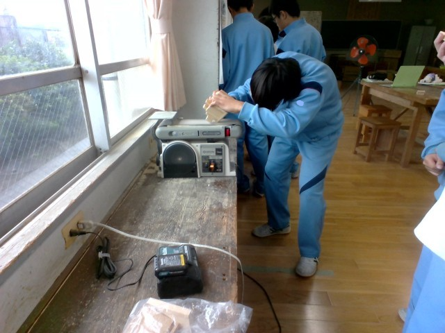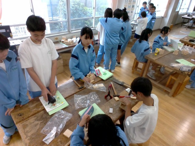 木材加工でペン立てを作成しています。もう組み上がっているものはヤスリがけなどの仕上げ工程へ向かっています。