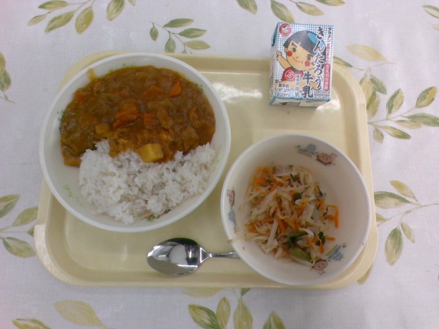 今日の給食は、牛乳、ポークカレーライス(麦入りご飯)、もやしと切り干し大根のナムル風でした。カレーライスが美味しくて、ご飯が進みました!