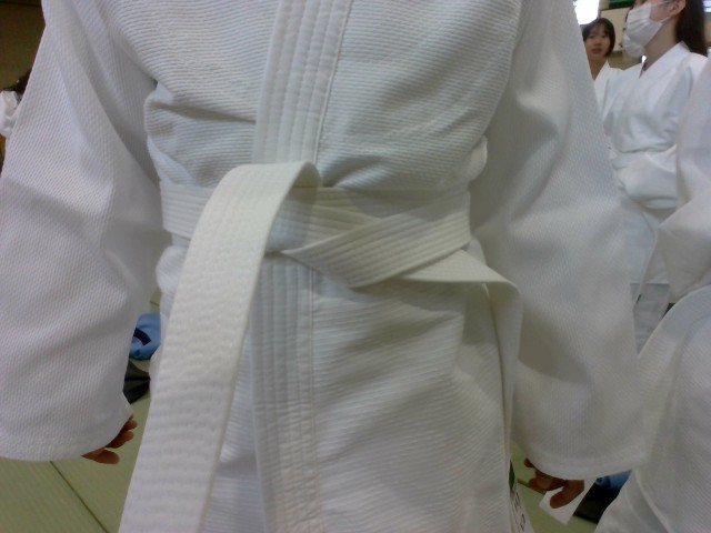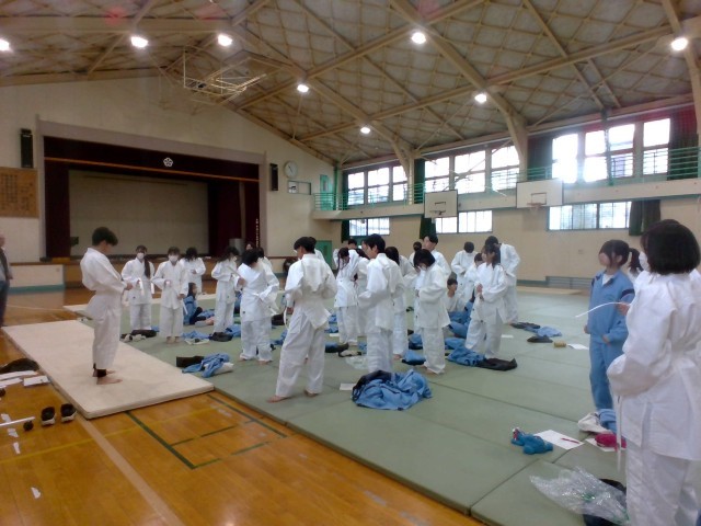 1年生の保健体育科では、柔道の単元に入りました。柔道着の帯の締め方を学習中です。