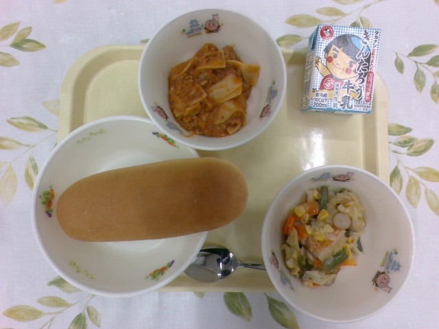 11月4日(火)の給食は、牛乳、コッペパン、ラザニア風、カラフルソテーでした。ラザニア風が温かくて美味しかったです!