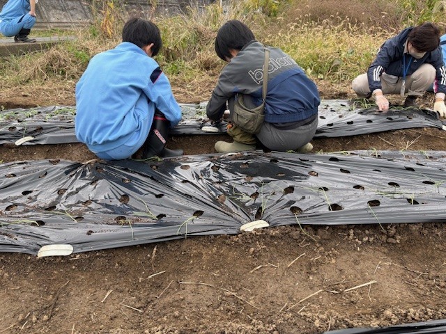 本日のF組では、大きい畑に玉ねぎの苗を植え、栽培を開始しました。