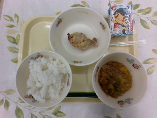 今日の給食は、牛乳、ご飯、鶏肉の塩こうじ焼き、高野豆腐のカレーそぼろ煮でした。カレーの良い香りに食欲をそそられました。