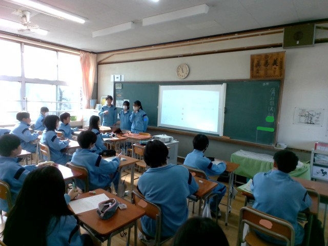 この日の総合では、各クラスの代表班が他クラスに行って、みんなの前で発表を行いました。