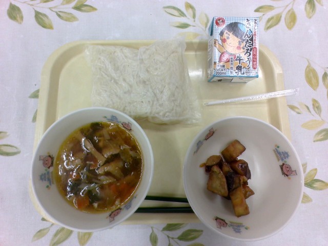 今日の給食は、牛乳、しょうゆラーメン(ホットラーメン)、キャラメルミルクさつま芋でした。キャラメルミルクさつま芋は甘くておいしかったです。職員室でも人気でした。