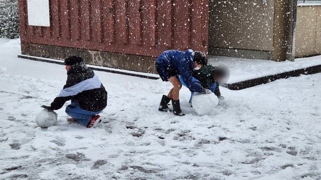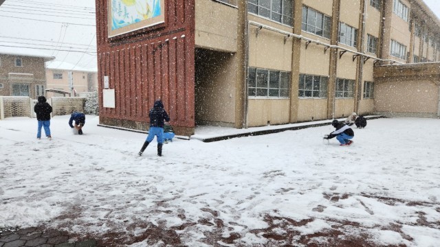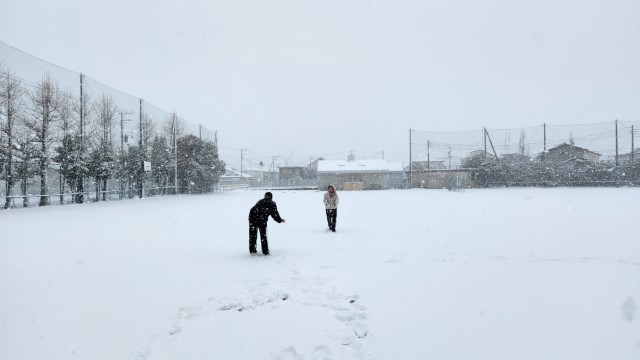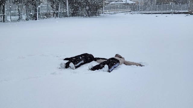 雪だるまを作ったり、グラウンドの真っ白なキャンパスに寝転んだりと、それぞれ楽しんでいました。