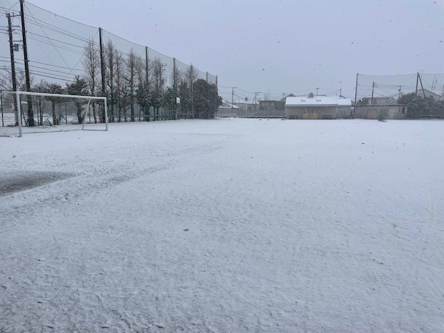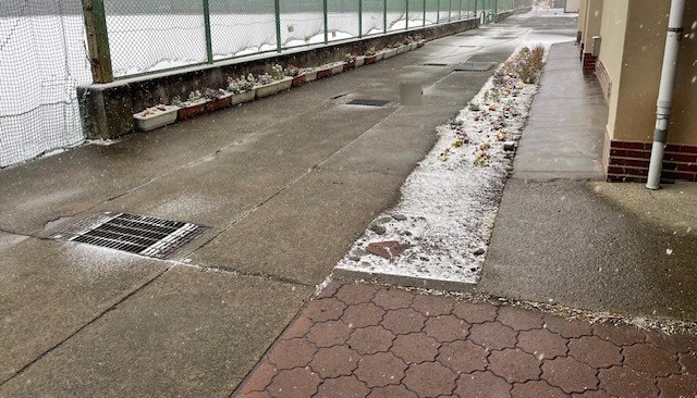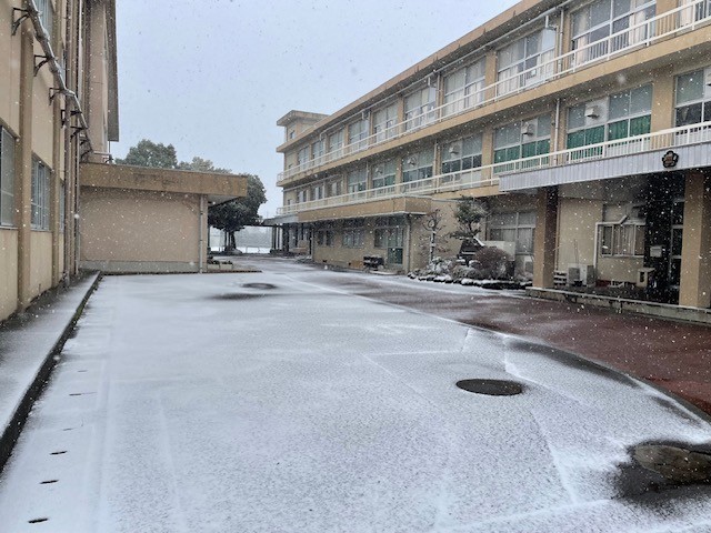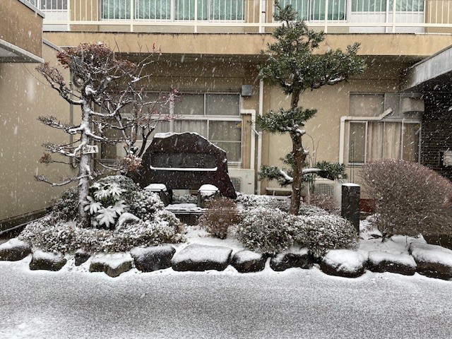 2月8日(日)の学校の様子です。この時はまだ降り始めてすこししか経っていないので、うっすら雪化粧という感じです。校長室前にある「真善美」の石碑が白くなってきています。