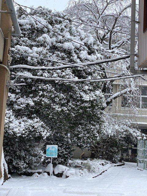 8日の午後の様子です。気が付いて外を見ると、真っ白になっていました。午前中とは違って、かなり降り積もっています。ビオトープも、真っ白です。だいぶ積もっているのが足跡からわかるでしょうか?