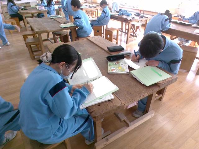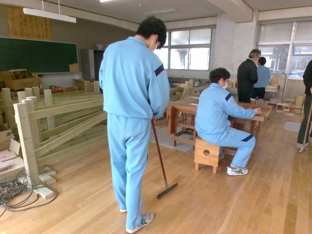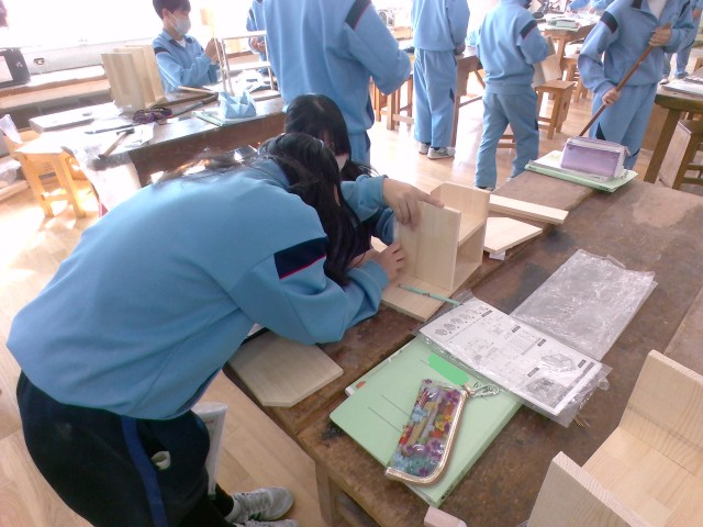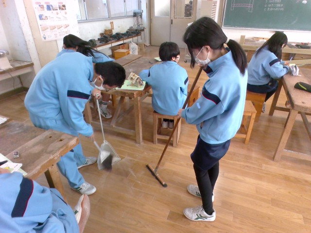 1年生の技術科では、本棚を作成しています。授業の終わりには、使用した場所をしっかりと掃除をします。そして振り返りカードの記入をして、今日の授業の振り返りをしています。完成まであと少しです。