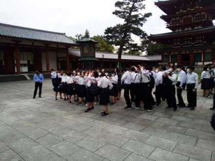 ガイドさんの案内で薬師寺の見学をしています。