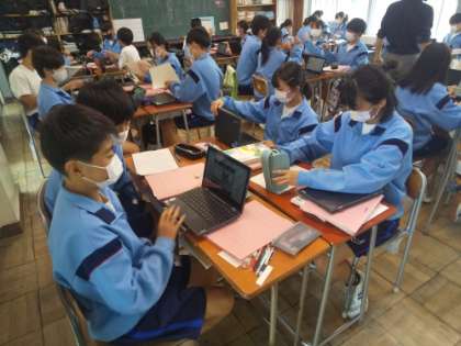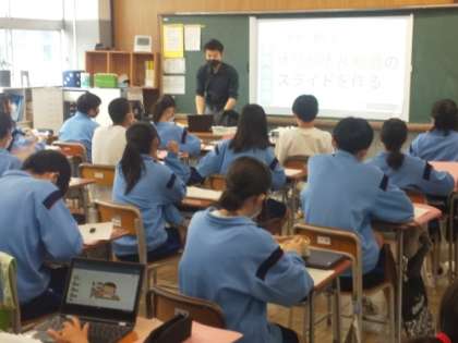 班になって クロームブックを活用し 短歌をスライドに書き込んでいました。