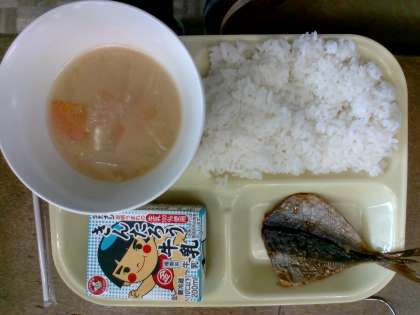 今日の給食は、牛乳、ご飯、鯵の醤油干し、根葉の味噌汁でした!