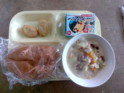 今日の給食は、牛乳、ソフトフランスパン、ナゲット、お豆のシチューでした!