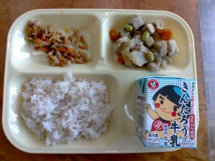 今日の給食は、牛乳、鶏ごぼうご飯(麦入りご飯)、高野豆腐の煮物でした!
