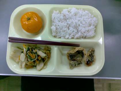 牛乳、麦入りご飯、冷凍みかん、地鯵のカレー揚げ、かまぼこと小松菜の辛子醤油炒めでした。