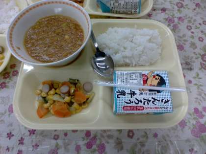 牛乳、豆と挽肉のカレー、チンゲン菜のソテーでした。