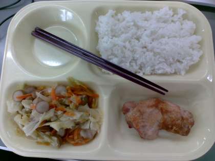 今日の給食は 牛乳、ご飯、鶏肉の玉ねぎソースがけ、野菜炒めでした。 鶏肉がやわらかく美味しかったです。