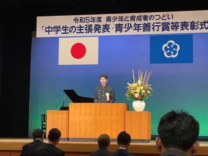 鴨宮中学校からは 三名が選ばれ 一名が 全体で発表をしました。
