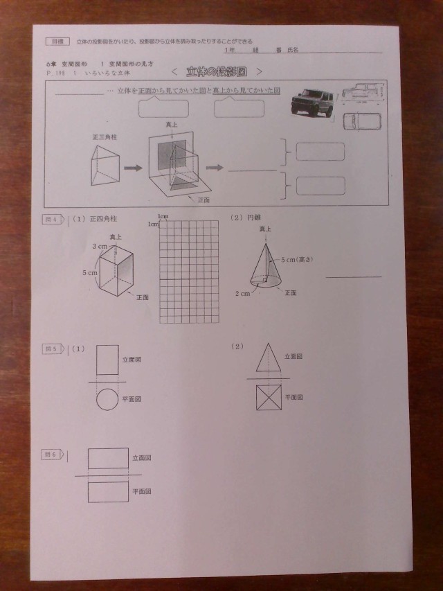 1年4組数学の授業です。立体の投影図について学習しています。真上から見たらどうなるのか?正面から見たらどうなるのか?ICTを使用して立体を動かして確認しています。