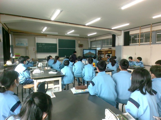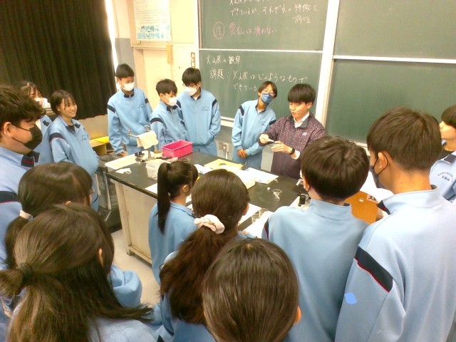 1年4組の理科の授業では火山について学んでいます。鹿児島県の桜島と長崎県の雲仙普賢岳の火山灰を洗って不純物を取り除き、顕微鏡で観察します。