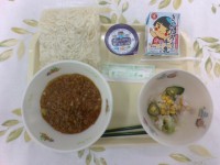 10月9日(木)の給食は、牛乳、ジャージャー麺(ホットラーメン)、キャベツとコー...