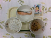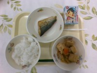 今日の給食は、牛乳、ご飯、鮭の塩焼き、肉じゃがでした。肉じゃがが甘くて美味しかっ...