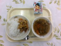 この日の給食のメニューは、牛乳、肉味噌ごはん(ご飯)、トックのお雑煮でした。トッ...