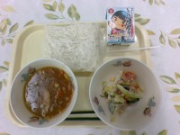この日の給食は、牛乳、カレー南蛮うどん(ゆで麺)、ビーンズサラダでした。ビーンズ...