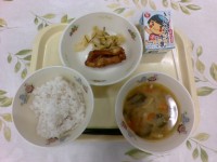 この日の給食は、牛乳、ご飯、かます棒の唐揚げ、白菜のごま和え、じゃが芋の味噌汁で...