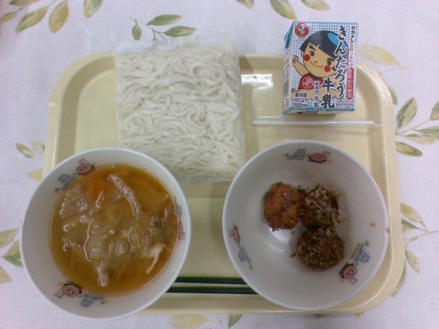 今日の給食は、牛乳、味噌ちゃんこうどん(ゆで麺)、揚ボールのたこ焼き風でした。揚...