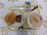 今日の給食は、牛乳、ロールパン、ハロウィンハンバーグ、ABCスープ、ミルメークコ...