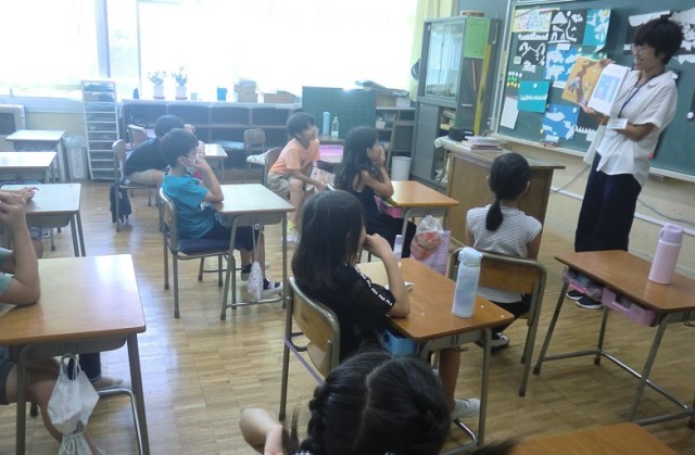 2年生の教室では、学校司書がことばあそびの絵本の読み聞かせを行っていました。