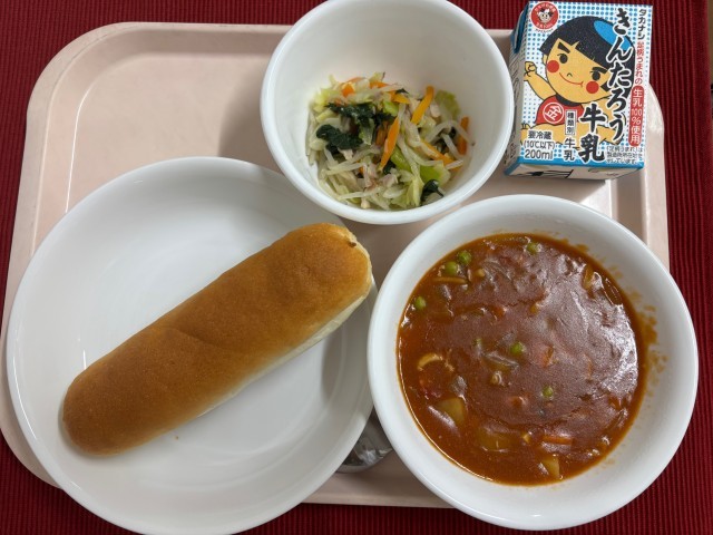 牛乳 米粉パン トマトシチュー キャベツとベーコンのソテー