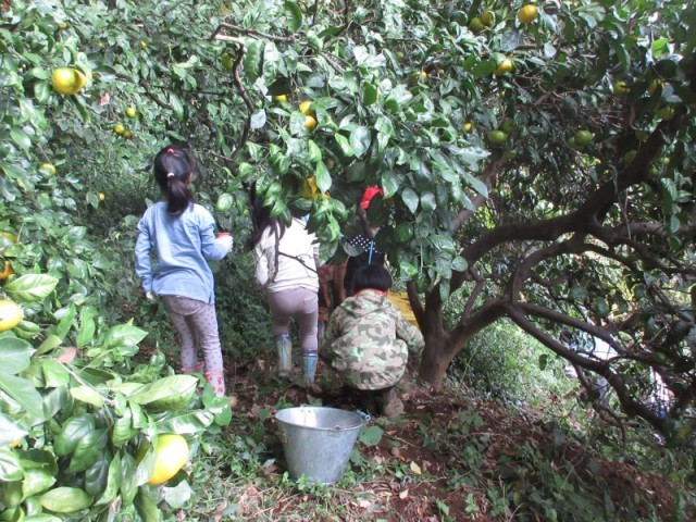 今日の農園タイムでは、1~3年生は色づいてきたみかんに肥料をあげていました。「木の根元近くよりは少し離れたところに撒くんだよ」と教わり、カップを手に肥料を撒きました。12月の初旬に「みかん狩り」を予定しているので、それまでに美味しくなることを願っています。