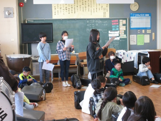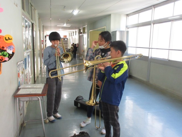 金管タイムでは、運動会までの活動を振り返り、次の「しおん交流会」に向けて練習をしています。各パートで出来ていないところを教え合っています。