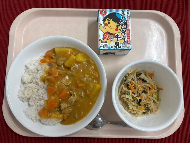 今日は子どもたちに大人気のカレーライスです。給食のカレーライスは手作りのルウを使用しているので、給食室では朝早くからルウの作成が始まります。給食時間の前から学校中にカレーの香りがして子どもたちも楽しみにしている様子でした。だんだんと寒くなり感染症が流行る季節になりましたが、しっかり食べて元気に過ごせると良いですね。