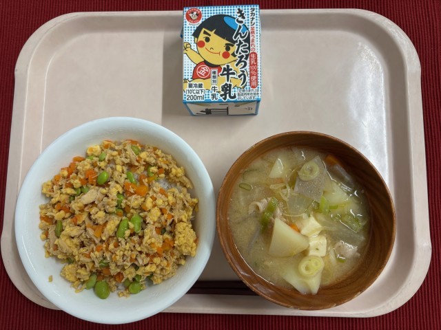 牛乳 ツナ三色丼 豚汁