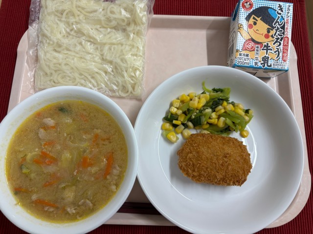 牛乳 みそラーメン 豚肉のコロッケ 青梗菜とコーンの炒め物
