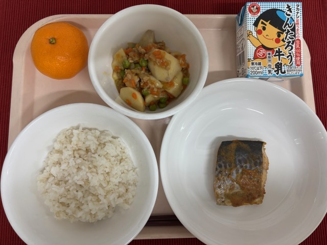 牛乳 麦ごはん 鰆の梅照り焼き 里芋のそぼろ煮 みかん