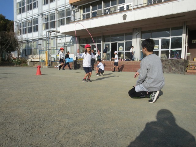前まわし跳びは、なかよし班に分かれ、異学年とペアを組んでお互いに跳んだ数を数えました。7分間の時間内に連続跳びできた数が記録となります。中には、長時間跳び続け、何百回という記録を残す子もいました。「がんばれ!」と応援する声も聞こえてきました。