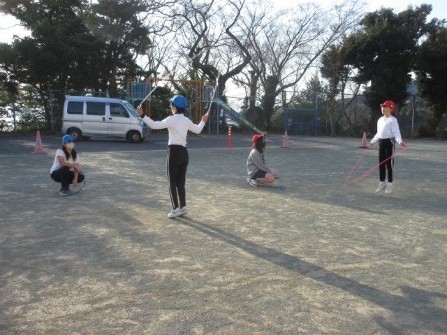 自由跳びは学年ごとに分かれ、自分の挑戦したい技の検定を受けます。「後ろ跳び」や「あや跳び」、学年が上がるにつれ「二重跳び」等に挑戦する子も増えました。