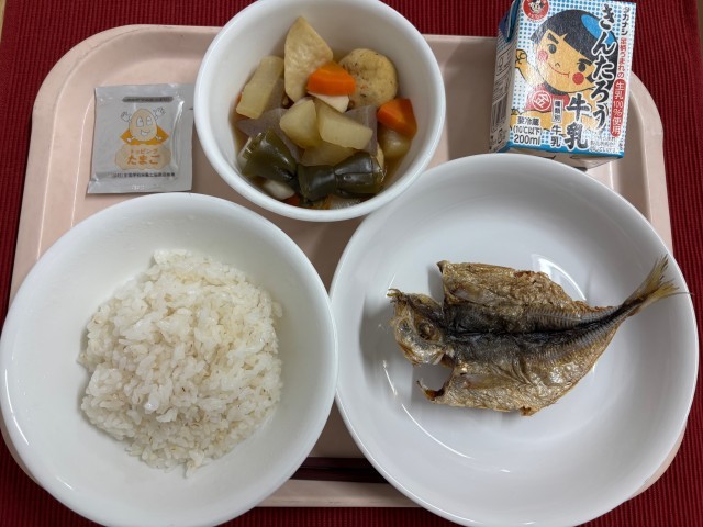 牛乳 麦ごはん アジのカリカリ揚げ おだわらっ子おでん たまごふりかけ