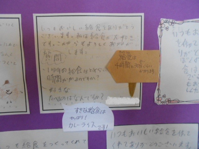 「いつもおいしい給食をありがとうございます」「好きな給食はラーメンと肉じゃがです」