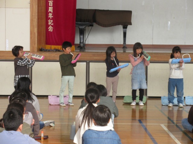 最初に「さんぽ」を手話付きで元気に歌いました。次に「きらきらぼし」を鍵盤ハーモニカで演奏しました。伴奏に合わせて、みんなでそろって演奏することができました。やっと発表できて1年生もほっとしたようです。