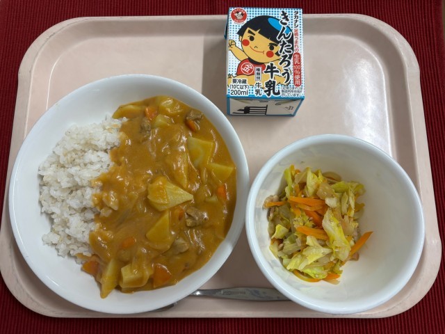 カレーライスには、脱脂粉乳が入っているので、カルシウムがたっぷりのメニューになります。カルシウムは私たちの骨や歯を丈夫にしてくれます。成長期のみなさんにとってかかせない栄養です。たくさんのスパイスや調味料と給食室で30分以上かけて作ったルウも使っています。味わって食べてもらえると嬉しいです。