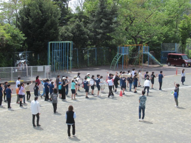 体育館で曲の練習をし、外に出て行進の練習をしました。