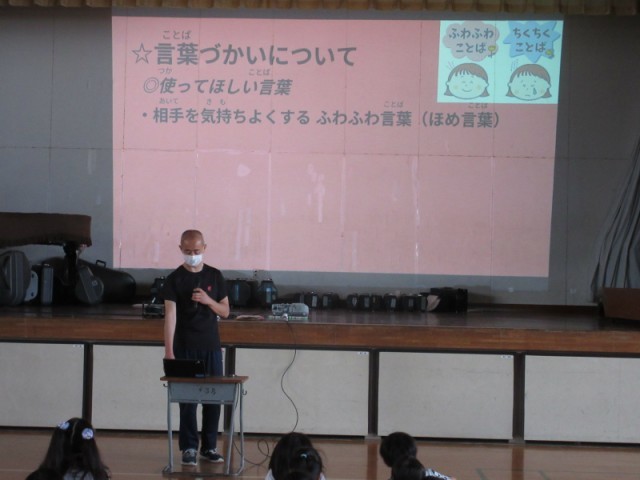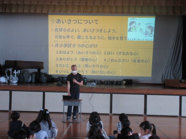 4月始めの朝会では、みんなが気持ちよく学校生活を送れるように、「片浦小のきまり」について話をしています。