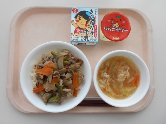 牛乳 五目ごはん(さくらめし) 春雨スープ りんごゼリー