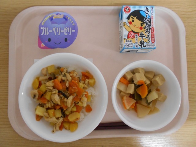 牛乳 秋の香りご飯 大根と高野豆腐の煮物 ブルーベリーゼリー