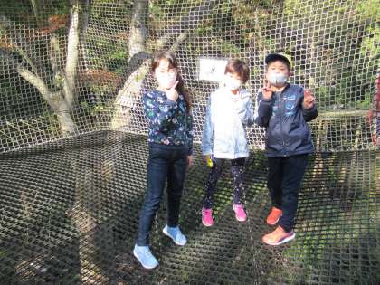 4・5年生は、11月17日(水)に「足柄森林公園 丸太の森」に遠足に行ってきました。予定していた9日(火)は雨天だったため延期となりましたが、この日は、お天気に恵まれて楽しく行ってくることができました。子どもたちは、「森の空中遊び パカブ」を思いっきりエンジョイしました。お弁当も美味しくいただきました。この行事は、コロナ禍のため完全な形で実施できなかった「防災宿泊学習」の代替行事として行いましたが、子どもたちは大満足の様子でした。思いっきり体を動かして疲れてしまったのか、帰りの電車の中では、多くの子が「夢の世界」に行ってしまった様子でした。