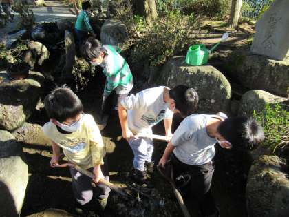 12月1日(水)に、運動場の片隅にある「洗心の池」の水抜き清掃を行いました。昼休みに、池の中にいた魚を助けた後、校長や職員が水を抜いた池からヘドロをスコップで掻き出していたら、3〜4年生の子どもたちが見ていて、快く手伝ってくれました。約2年ぶりの清掃となりましたので、とても汚かったのですが、子どもたちは一生懸命に働いてくれました。とても頼もしかったです。みんな、ありがとう!!